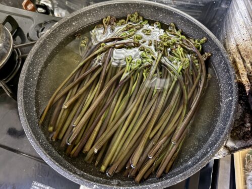 ワラビは木灰と一緒に煮てあく抜きをします